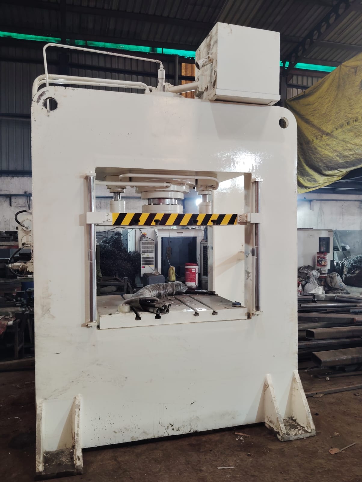 A Hydraulic Press Machine is a powerful machine used to press, shape, or bend materials like metal and plastic using hydraulic pressure. It works with the help of a fluid (usually oil) that creates a strong force to push or press objects. This machine is commonly used in factories to make car parts, kitchen utensils, and many other products. It is easy to operate and gives very accurate results, making the work faster and smoother. Because it uses hydraulic power, it can handle heavy jobs without needing too much human effort.